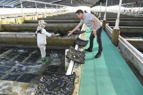 本报讯 (记者 郑楚藩) 记者近日在惠来县鲍鱼产业园养殖基地看到,养殖池内整齐分布着黑色养殖板,从海上引入的海水源源不断地流入池中,工作人员正在养殖池观察鲍鱼生长情况(见图。郑楚藩 摄)。