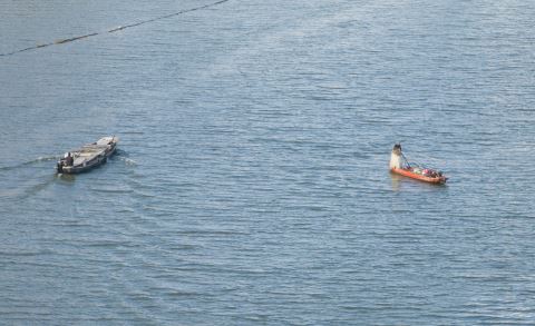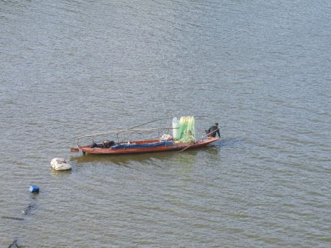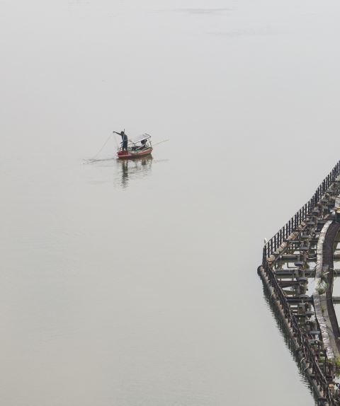冬日的榕江北河,渔民划着小船布网劳作,一人一舟,捕捉生活的希望, 呈现出一幅人与自然和谐共生的美丽画卷。