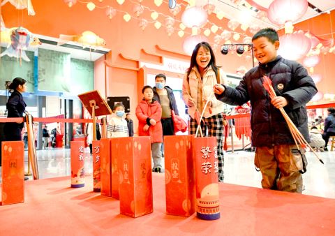 12月21日观众在展厅内互动体验传统节日项目——投壶。