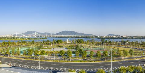 临江南路、滨江大道交会处的双溪明月公园是市民休闲娱乐的好去处。郑楚藩 摄