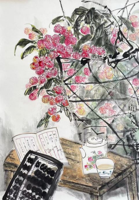 此次画展共展出林石川的 80 多件精品力作,展现其独特的创作视角和艺术造诣。画家怀着对家乡的眷恋和对生活的洞察,将情感与思考倾注于画笔之下。其精心绘就的《大利入账》,以荔枝、算盘、账册等元素巧妙组合,传递出新年的美好祝福。画家笔下非遗工夫茶主题画作,以茶壶、茶杯、茶炉和茶点等为内容,并题跋“过门都是客,往来三鼎茶”“茶薄人情厚”“吃茶” 等题字,淋漓尽致地展现潮汕人热情好客,感受茶香背后浓浓的人情味。家乡风光更是勾起游子情愫,家中的花圃,祠堂中的桌椅、柜几,青山绿水等,处处熟悉的景色,唤起游子心中的乡愁。其笔下的乡愁已化作具体景致,熟悉的角落、美好的时光,引发观者对家乡的共鸣与思念。记录城乡生活的画作中,热闹非凡的英歌舞场景,怡然自得的夕阳生活,温馨的早餐街景,这些画作串联起画家在家乡他乡的生活百态,展现人们的幸福生活。