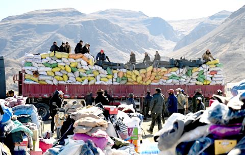 日喀则市拉孜县拉孜镇措布村处于定日县“1·07”地震重灾区。地震当天,村里群众就全部住进防灾帐篷。1月9日,包括帐篷、火炉、食品在内的大量救灾物资抵达措布村,由西藏自治区森林消防总队派出的救援队伍也抵达该村,协助派发物资、搭建帐篷,保证受灾群众得到妥善安置。图为1月9日受灾群众在措布村卸载救灾物资。 新华社 发