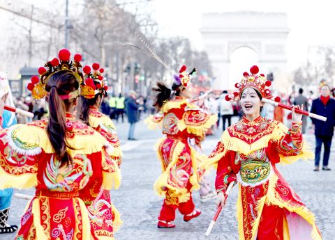 2月2日,来自广东汕头潮阳的西门英歌队在法国巴黎香榭丽舍大街表演。新华社 发