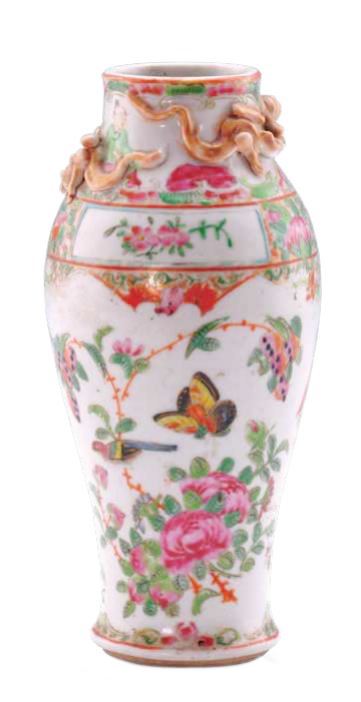 直口,平唇,颈略外展,溜肩,上腹略鼓,腹中部以下渐收,至下腹略束,近底处外撇,矮圈足。颈部堆贴蟠螭龙加彩,上腹部二金色弦间设开光,开光内外均绘花卉。腹中部以下开光图案绘仕女及蝶鸟花卉。器形修长优美,线条流畅柔和,图案疏密有致,人物形象生动,红、绿、金彩对比强烈,金碧辉煌,彩绘华丽。