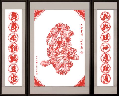 这幅中堂高127厘米、宽83厘米,对联的每一幅高127厘米、宽36厘米,经装裱后配上玻璃、木框而成。剪纸以红宣纸为载体,用铰刀剪制,除中堂四个角的纹样另再拼贴外,其他的表现物象都是相互连接,构成一个协调完整的画面。