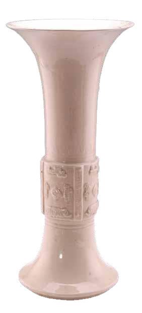 白色瓷胎,器形较修长,喇叭形口,长束颈,腹部凸起,腹上面有四条均布凸棱,足外撇。腹部和凸棱均印回纹,腹上下均印一周弦纹和莲花纹。通体施白釉。造型秀美奇巧,釉色均匀润泽,纹饰美观得体。早期的花觚通常称为尊,是仿青铜器造型的一种陈设品瓷。花觚始于元代,主要流行于明嘉靖至清乾隆时期。除陈设之外,民间多用于插花,还有用作供器的。