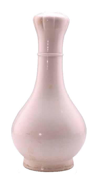 白色瓷胎。蒜头形敛口,细长颈,削肩,垂腹,圈足外撇。颈上部有一圈凸弦纹。通体施白釉。造型清秀,线条精美流畅。釉面平整细腻,釉色均净润泽。为潮州窑白瓷佳品。蒜头瓶为明清时期流行器。