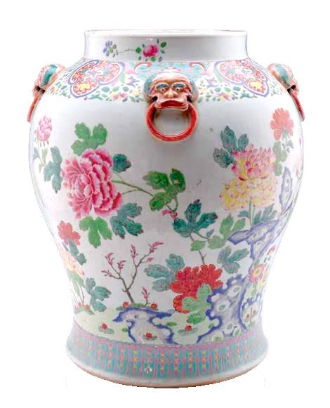 直口,圆唇,短颈,溜肩,上腹鼓起,下腹收束,矮圈足。肩部堆贴四含环铺首,绘如意花卉纹。腹部绘牡丹,花叶随风飘动,花色彩各异,美丽绽放。近足处绘一圈规整纹饰。整体色彩鲜艳。器形厚重,雍容富贵。