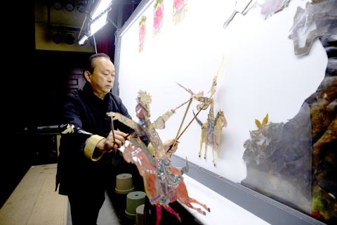 ①在位于阆中市的四川王皮影艺术博物馆,王彪为观众表演皮影戏《千里走单骑》(2月19日摄)。