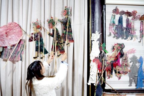 ③王彪的徒弟李其芳在整理表演用的影人(2月19日摄)。新华社 发