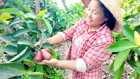 据种植户王木洲介绍,在过去7年的莲雾种植中,他摸索出适合本地气候的种植方案,使黑金刚莲雾具有显著的反季节优势。“当市场鲜果供应紧缺时,我们的产品刚好填补空白,3斤装的莲雾礼盒售价100元,在市场上仍供不应求。”王木洲说,目前黑金刚莲雾亩产稳定在3000斤,糖度保持10度以上,凭借果色鲜艳、口感脆甜赢得高端市场青睐。为进一步拓宽销售渠道,东港镇强村公司通过广东惠来商会的牵线搭桥,与永昌顺果品有限公司达成战略合作,打通了东港镇农产品直销大湾区商超产销链。“如今只需专心种好果,销售有企业兜底!”王木洲高兴地说。