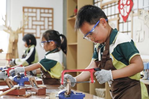 4月29日,海安市高新区实验幼儿园的小朋友在体验木工制作。为迎接“五一”国际劳动节,江苏省海安市高新区实验幼儿园的孩子积极参与木工、泥塑、编织等手工劳动,体验劳动的魅力。新华社 发