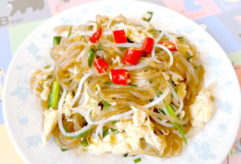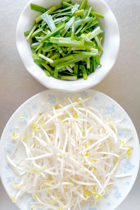绿豆芽、粉条、韭菜、鸡蛋、酱油、盐、蒜末、食用油。