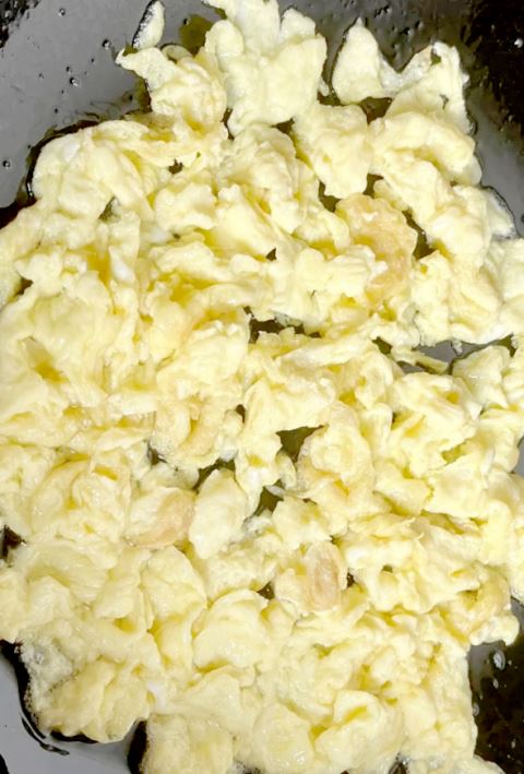 3.热锅凉油,倒入打散的鸡蛋液,蛋液在锅中迅速凝固,用铲子翻炒,将鸡蛋煎成小块,盛出备用;