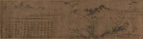 图中卧石瘦竹、远渚烟水、云雾空蒙,于“窄窄画幅”内如阅千里江山,是一种高度的艺术概括。展开画卷,首先映入眼帘的是一片远山烟水,可谓“景物至绝而微茫缥缈”。慢慢的又露出了“风枝雨叶瘦土竹,龙蹲虎踞苍藓石”和湍流之水,此图画石“磊落雄壮,苍硬顽涩,矾头菱面,层叠厚薄,覆压重深”,写竹“其茂梢劲节,吟风泻露、拂云筛月之态,无不曲尽其妙”,其水则犹如“输泻跳蹙之势,汹汹欲崩屋”。好一派紧张热闹气氛,扣人心弦。沿水势而上,激流渐缓,淡墨点染的烟水、云山、远树使构图更有一种险中取胜和搏动、层次丰富的艺术效果。