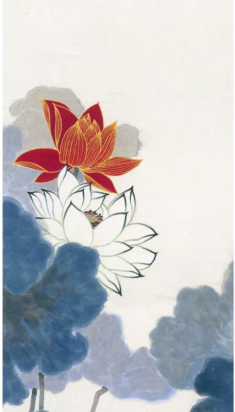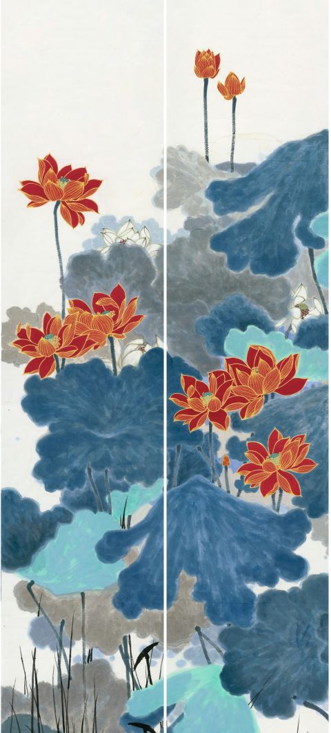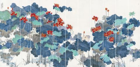 这幅创作尺幅巨大,高7米×横14米,我希冀追求一种充实而博大的美感。张大千先生1960年61岁时创作了《巨荷》,高3.6米×横8米 ,画面豪迈奔放,去年(2024年)在香港展出,还有一幅1935年36岁时创作的《五色荷花》,画面典雅祥和,我借鉴了这两幅作品,在这个基础上更加注重装饰感,也将自己对荷花的感受融入其中,画面前景的荷叶用花青反复渲染,在一个整体色调里面寻找节奏,后景用偏暖的淡赭花青铺陈淡叶,并随着感觉安排墨色,增加纵深感,营造荷叶密密田田,追寻一种误入藕花深处,仿佛人的视觉切换成游禽的视线,身在荷叶之中,难辨东西南北,感受到的是荷叶如山如云,起伏跌宕,层峦叠嶂,延绵不息,扑面而来的是汹涌澎湃的豪迈气息。荷花的数量以金线勾勒重彩红荷为主,营造富丽堂皇的装饰感。为防止红花太多过于装饰单调,通过白荷来调整红荷的虚实节奏,其间搭配赭、青、绿颜色的荷花作为点缀,用五色荷花(红、白、赭、青、绿)象征“五福祥瑞”,来寓意美好寄托。
