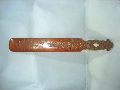 竹雕张良拾履裁纸刀。裁纸刀采用湘妃竹制作,两面圆弧,三面开刃,是古时文人用来裁纸之物。刀刃上雕刻着张良拾履图。图中的张良捧着一只鞋子站立在桥头,像是对人说着什么。他头戴巾帽,苍髯如戟,半挽衣袖,身体微微前倾,态度非常恭敬。刀刃的另一面雕刻着梅花图,刀柄上密布着变体缠枝莲纹,色彩鲜明悦目。整个裁纸刀雕功精湛,刻画人物惟妙惟肖,包浆红润如玉,光泽柔和,不浮不嚣,锋芒内敛,有一种沉静优雅的魅力。