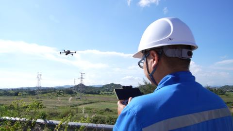 操作人员正在用无人机进行线路巡检。袁继豪 摄