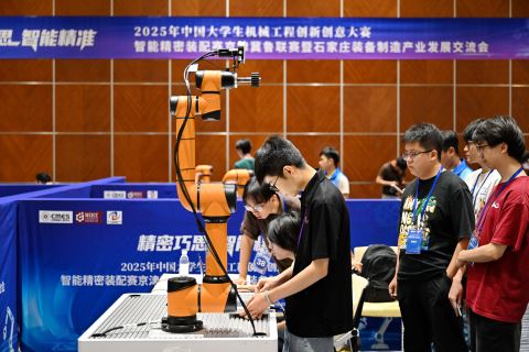 9月14日,2025年中国大学生机械工程创新创意大赛智能精密装配赛京津冀鲁联赛在河北省石家庄市栾城区航空中心举行。本次联赛吸引了来自清华大学、北京理工大学、河北科技大学等数十所高校、近百支队伍参赛。比赛设置实操调试与答辩汇报两个环节,旨在突出智能装备与传统工艺在实践中的融合创新应用,深度考察参赛者对跨领域技术整合的掌握程度,全面考察学生的创新思维与技术应用能力。图为9月14日参赛选手在比赛中调试设备。新华社 发