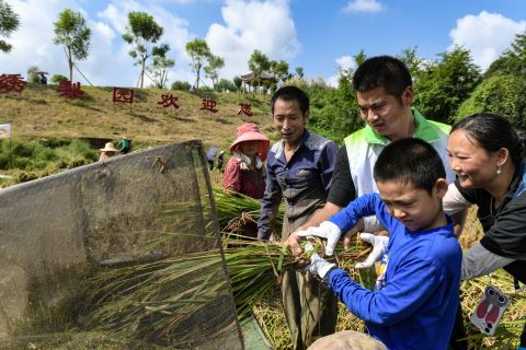 图为9月13日在四川省成都市双流区永安镇梨园村,孩子们在家长的带领下体验打稻谷。新华社 发