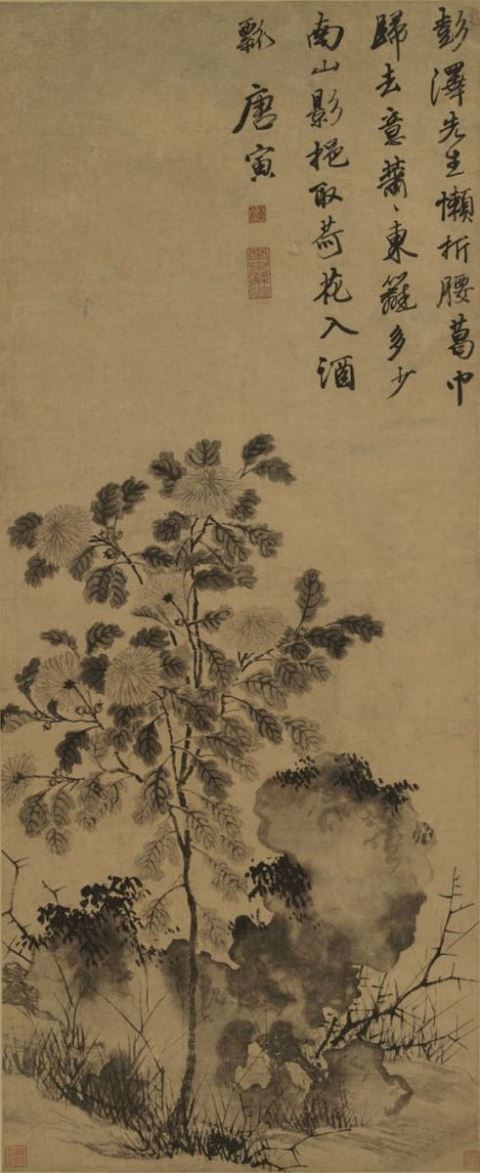 《东篱归影图》是唐寅晚年以没骨法绘就的墨色诗篇。画面中,秋菊傲立东篱之下,花瓣似蝶翼般轻盈颤动,墨色浓淡相宜,尽显菊之灵动与生机。菊花旁,嶙峋奇石兀然而立,石体仅用浓墨勾勒轮廓,线条简洁却力透纸背,与柔美的菊花形成刚柔相济之美。背景留白,给人以无限遐想空间,仿佛那片空灵之处便是远离尘世的净土。右上方,唐寅以行书题诗:“彭泽先生懒折腰,葛巾归去意萧萧。东篱多少南山影,挹取荷花入酒瓢。”诗中借陶渊明之典,抒发自身历经沧桑后的淡泊心境。整幅画作,以简洁的构图、写意的笔法,营造出一种孤高绝俗、悠然自得的氛围,让观者仿若置身于秋日黄昏的东篱之下,感受那份远离喧嚣、回归本真的宁静与超脱。