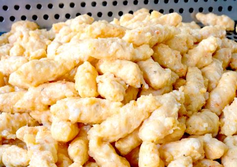 在生产现场,记者看到同为惠来虾枣县级非遗代表性传承人的詹泽新左手握虾浆,从虎口挤出,右手持勺柄迅速刮下,一个个两头尖的虾枣便成型了,似梭形,像枣核。“这种形状炸的时候容易熟,刮起来也快。”林创城说,这看似简单的动作,却需要长时间练习才能做到大小均匀。