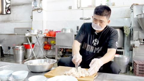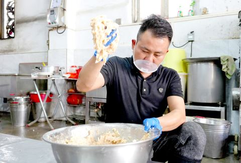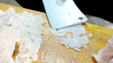 正如林创城所说,传统工艺对此颇有讲究:师傅会将一半虾肉细细拍打成泥,另一半则切成颗粒状。如此搭配,能让成品虾枣既保留虾肉颗粒带来的扎实嚼劲,又兼具虾泥赋予的细腻口感,层次格外丰富。调味环节追求“少而精”,仅加入少许白糖、盐与味精,便能最大程度激发虾肉本身的鲜甜。接着打入鸭蛋清,其作用是帮助虾浆更好地起胶,让虾枣入口更显弹牙。此外,每10斤虾肉中还需加入7两白肉丁,这一配比能进一步提升虾枣的软嫩度,让口感更显饱满。