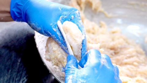 “接着将虾浆进行反复摔打,这个环节直接决定虾枣的口感。一般来说,要将虾浆反复摔打,直到它粘在手上反手不掉,这样做出来的虾枣口感便是最好。”林创城介绍。