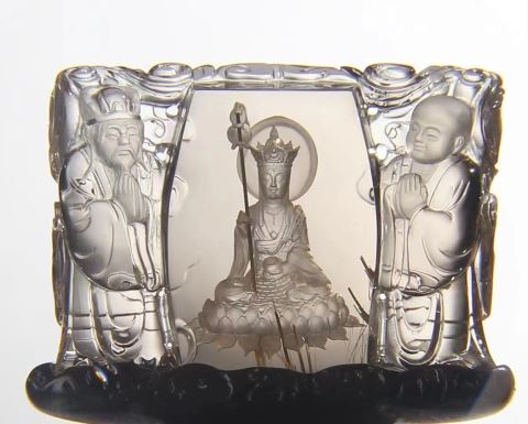 今赏读的这件魏敦旭创作的水晶雕刻作品《地藏王菩萨》,2014年6月获第五届中国玉石雕刻“玉星奖”银奖,晶体长69毫米、宽50毫米、高13毫米,也是常见的佛教造像,但与其以往作品不同之处就在于用天然钛晶为原料,且将阴、阳雕刻之技艺融汇于一体,作者依据原料的特性进行创作,在方寸之间雕刻三尊造像,赋予天然水晶的艺术生命,这正是作者艺术修养和技艺水平的真实体现,让人不得不为之惊叹!