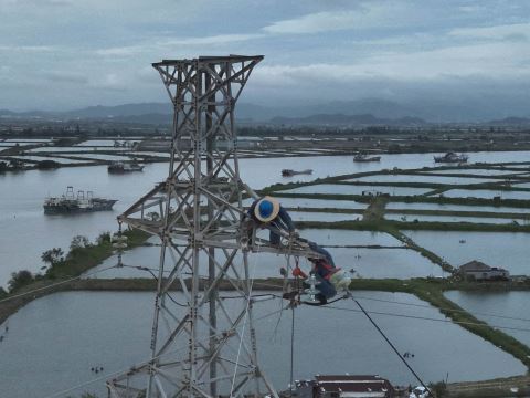 35米的高度,在陆地已是十二层楼的高度,可在空旷的跨海区域,海风裹挟着水汽不断冲击塔身,每向上攀爬一步,都要在脚下的铁塔上找准支撑。“跨入海口作业最怕‘风突然变脸’,咱们多检查一秒,队员就多一分安全。”他蹲下身,再次检查了登高人员即将使用的安全带,随后又绕着铁搭走了一圈,确认铁搭地脚螺栓无松动。这些细节,是他16年安全监管生涯里总结出的“保命经验”。