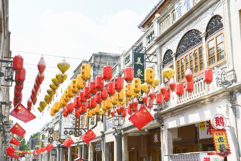 在市区临江北路,一面面五星红旗悬挂在路灯杆上,整齐划一,鲜艳的国旗装点着市区,形成了一道道亮丽的风景线。在揭阳古城中山路、思贤路,喜庆的灯笼、鲜艳的五星红旗与古色古香的骑楼交相辉映,散发着喜庆、祥和的节日气息,装扮一新的揭阳古城以全新的面貌喜迎八方游客,不少市民已抢先拍照。巡城所到的市区其他城市主干道也打扫得干干净净,鲜红的五星红旗与整洁的街道、靓丽的绿植相互映衬,节日氛围感拉满。
