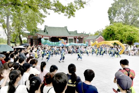 走进揭阳古城,只见青石板路蜿蜒向前,百年骑楼的灰塑瓦当,在阳光下泛着温润的光。思贤路上,“进贤尚礼”榕城区非遗文创体验馆里,精巧的文创产品让人挪不开眼;揭阳古城惠来馆中,隆江猪脚卤香扑鼻。城隍庙前,中华战舞英歌舞鼓点铿锵,雄浑豪放的舞姿引得游客纷纷驻足。来自深圳的陈女士举着相机不停按动快门,兴奋地说:“来古城不只是看老建筑!能亲手做红桃粿、喝地道工夫茶,还能近距离看英歌舞;到了晚上,铁枝木偶戏、猜灯谜等活动也特别精彩,这种沉浸式的古城体验,比单纯逛街有意思多了。”