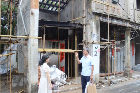 方羽生(右)在中山路南门头西侧的利民文具店旧址(修缮中)述说历史。阿 龙 摄