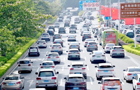 国庆中秋假期最后一天,各地迎来返程高峰。图为10月8日进城车辆行驶在广西南宁市民族大道上。
