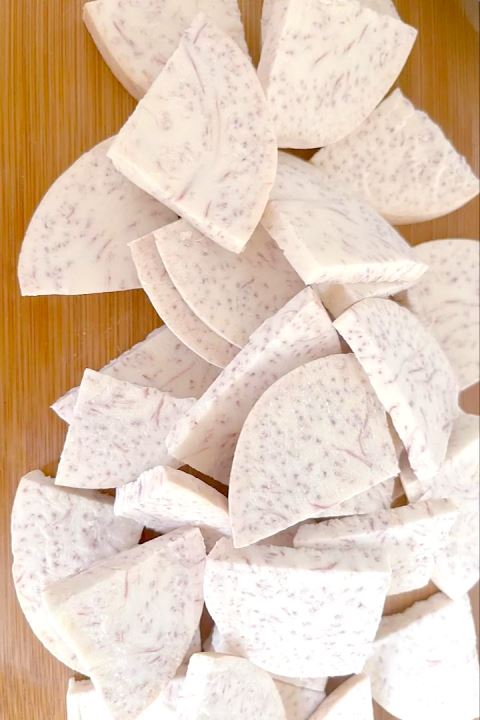 制作芋头蒸排骨,先做食材预处理:选大小适中的芋头,去皮后用清水冲净黏液(建议戴手套防皮肤瘙痒),按容器大小切1厘米厚均匀薄片,过厚难熟、过薄易烂;排骨优先选肋排,提前浸泡去血水,多次换水以减腥味。