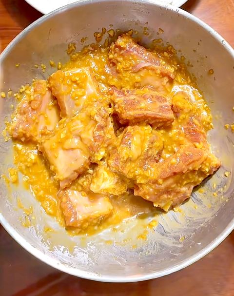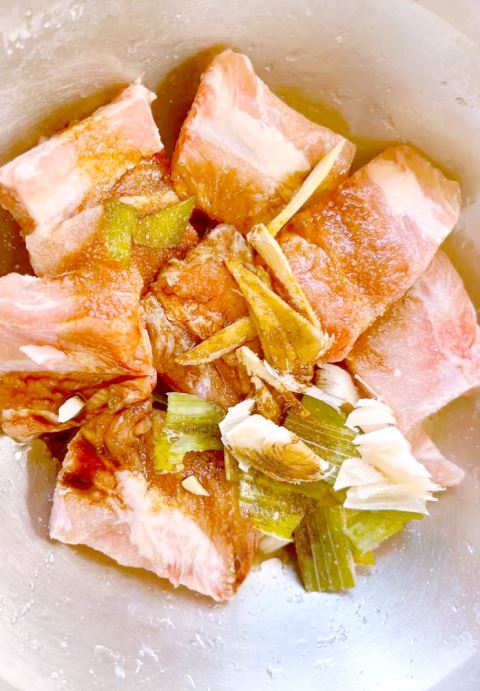 接着腌制排骨:取干净大碗放沥干水分的排骨,加1汤匙生抽、半勺盐、1汤匙蚝油、适量葱姜末、1茶匙白酒(可换料酒)、2汤匙玉米淀粉和1汤匙食用油,充分抓拌至排骨裹满料汁,盖保鲜膜冷藏腌15至30分钟让味道渗透。