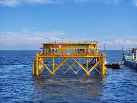 在繁忙的海上施工一线,党员先锋队带头冲锋,鲜红的党旗在作业平台上迎风飘扬。