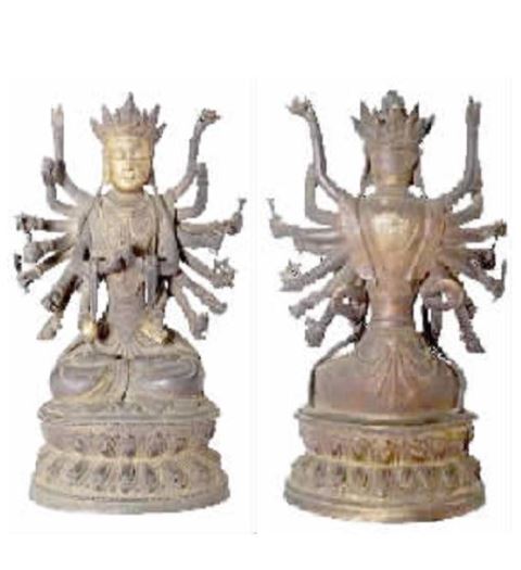 共十八只手,象征千佛。中央主臂合掌,两边各有八只手,向两侧对称张开,各执法器,有普度众生的法器,也有惩戒作恶的法器。面容慈祥,双目低含,头戴宝冠,身着衣裙,佩带臂圈、手钏;当胸宝珠与璎珞环绕,赤脚全跏趺,盘坐于莲花座上。造型端庄,姿态优美。