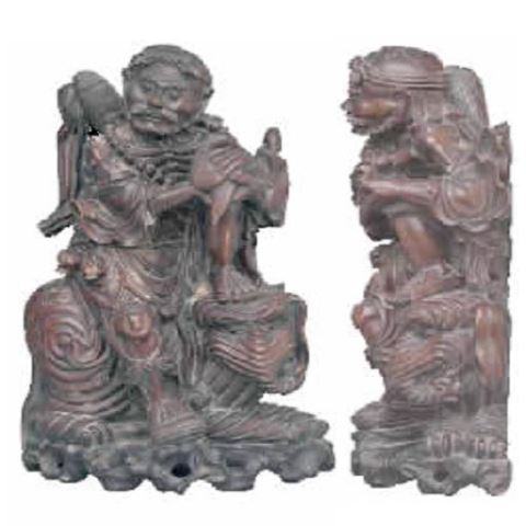 采用圆雕手法,利用木头外表皱纹,精心雕刻。罗汉项戴佛珠,腰插拂尘。头略右偏,气度非凡,两手挹物于左胸,坐于象背上,左脚踏象头,右脚踏地。象为卧姿,头右转,鼻向左弯曲。象是佛法的象征,比喻威力大,能耐劳又能致远。雕像造型优美,线条清晰,技艺精湛,人物栩栩如生。