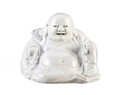 白瓷胎。坐像体态丰满,脸型宽大,两耳垂肩,张口微笑,身穿袈裟,袒露胸腹,右腿盘在前面,左腿屈起。右手放于布袋上,左手拿寿桃放于腿膝上。通体施白釉。造型优美,面相形态逼真,釉色洁白透亮。把弥勒佛宽容、和善、智慧、幽默、快乐的特点充分表现出来。