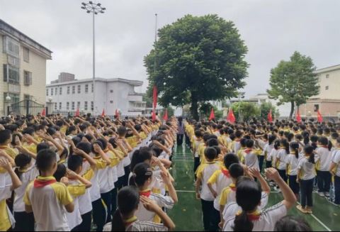 仪式以庄严的升旗仪式拉开序幕。伴随着雄壮的《中华人民共和国国歌》,五星红旗缓缓升起,全体师生肃立行注目礼,稚嫩的脸庞上满是肃穆。升旗仪式结束后,大队旗手手握鲜艳的队旗,在两名护旗手的护卫下,迈着整齐有力的步伐庄严出旗。全场少先队员立即挺直腰板,右手握拳举过头顶,高唱《中国少年先锋队队歌》,“我们是共产主义接班人,继承革命先辈的光荣传统”的歌声响彻校园,少年们的朝气与使命感感染着在场每一个人。