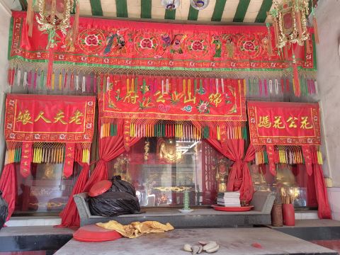门前香案之上,四座香炉静静伫立。居中者最为古旧,石刻字迹和纹饰已在时光侵蚀下模糊难辨,却仿佛默默诉说着几百年沧桑。殿内,大红帷幔高悬,绣着八仙过海、牡丹吐蕊等吉祥纹样,华贵而不失典雅。正中帷幔上“绵山公府”四个鎏金大字熠熠生辉,左右分列“花公花妈”“老夫人娘”的绣品,尽显古朴规制。