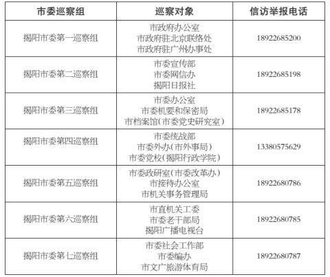 进驻期间,市委各巡察组专门开通值班电话、意见箱和邮政信箱,受理具体问题反映(受理时间为工作日上午8:30-12:00、下午2:30-5:30)。邮政信箱:揭阳市榕城区临江北路市机关大院1号楼911室转市委相关巡察组收。其他不属于巡察受理范围的信访问题,将按照分级负责、属地管理的原则,移交被巡察单位和有关部门认真处理。