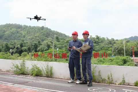 揭阳供电局青年服务队用无人机对电力设备进行巡视。