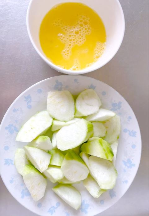 1.将丝瓜去皮,然后切成滚刀块;鸡蛋在碗中打散,再切点葱姜末;
