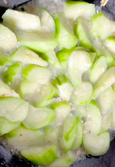 3.热锅凉油,油热后倒入丝瓜块大火翻炒,然后加入葱姜末炒均匀;