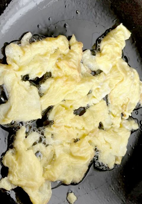 2.起锅烧油,油热后倒入之前打散的鸡蛋液,稍微定型后将鸡蛋炒熟炒散,盛出备用;