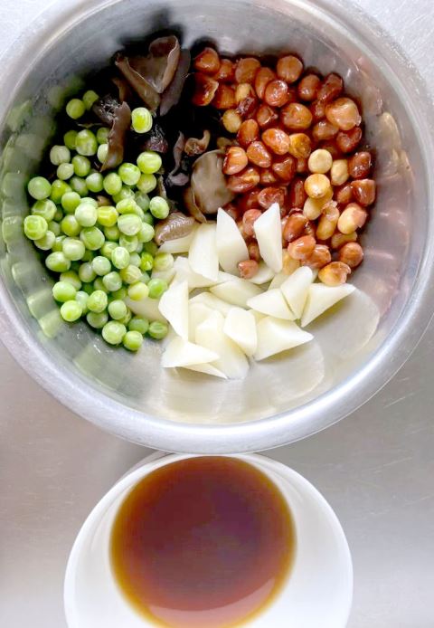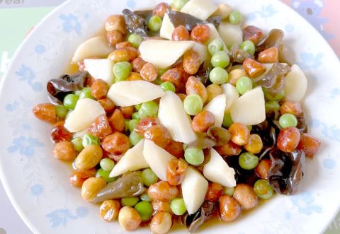 山药、木耳、花生米、青豆、生抽、醋、盐、糖、蚝油。