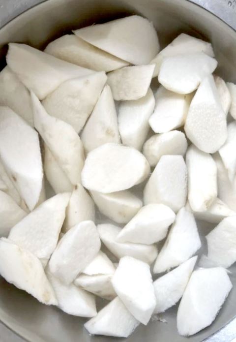 1.将木耳提前浸泡,山药去皮洗净,然后切成滚刀块,并放入淡盐水中浸泡(防止山药块氧化变黑);