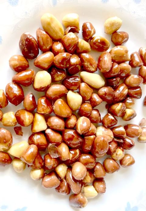 2.热锅凉油,放入少量花生米,小火慢炸,加少许盐,直至酥脆;